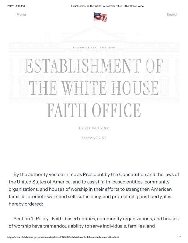 dropbox/COLLECTION- Government/The White House/EO's/Faith-Based EOs/Establishment of The White House Faith Office – The White House.pdf