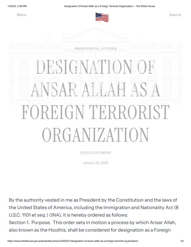 dropbox/COLLECTION- Government/The White House/EO's/First Week EO's/Designation Of Ansar Allah as a Foreign Terrorist Organization – The White House.pdf