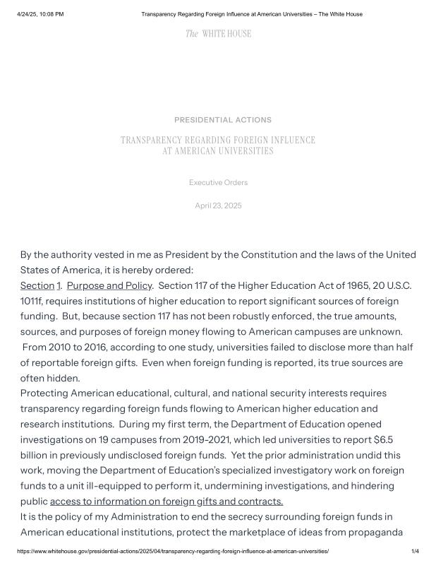 dropbox/COLLECTION- Government/The White House/EO's/Higher Education EOs/Transparency Regarding Foreign Influence at American Universities – The White House.pdf