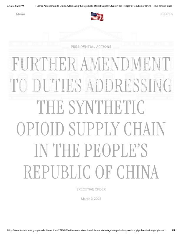 dropbox/COLLECTION- Government/The White House/EO's/International Relations EOs/Further Amendment to Duties Addressing the Synthetic Opioid Supply Chain in the People's Republic of China – The White House.pdf