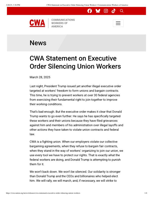 dropbox/COLLECTION- Government/The White House/EO's/trump EO union bargaining/CWA Statement on Executive Order Silencing Union Workers _ Communications Workers of America.pdf