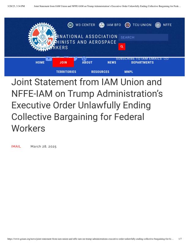 dropbox/COLLECTION- Government/The White House/EO's/trump EO union bargaining/Joint Statement from IAM Union and NFFE-IAM on Trump Administration’s Executive Order Unlawfully Ending Collective Bargaining for Federal Workers - IAMAW.pdf