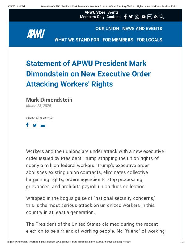 dropbox/COLLECTION- Government/The White House/EO's/trump EO union bargaining/Statement of APWU President Mark Dimondstein on New Executive Order Attacking Workers' Rights _ American Postal Workers Union.pdf