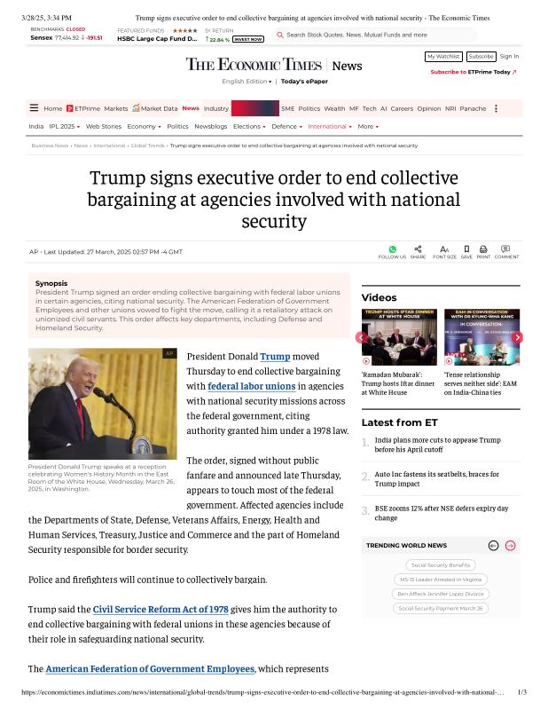 dropbox/COLLECTION- Government/The White House/EO's/trump EO union bargaining/Trump signs executive order to end collective bargaining at agencies involved with national security - The Economic Times.pdf