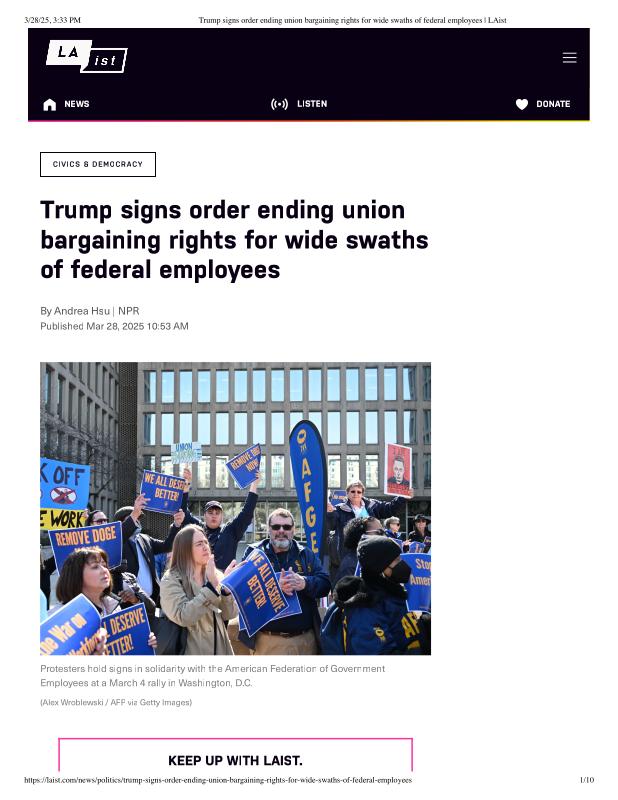 dropbox/COLLECTION- Government/The White House/EO's/trump EO union bargaining/Trump signs order ending union bargaining rights for wide swaths of federal employees _ LAist.pdf