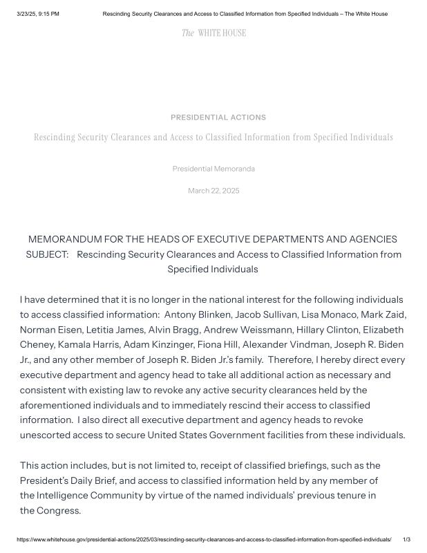 dropbox/COLLECTION- Government/The White House/Memorandums/Censorship and Transparency Memorandums/Rescinding Security Clearances and Access to Classified Information from Specified Individuals – The White House.pdf