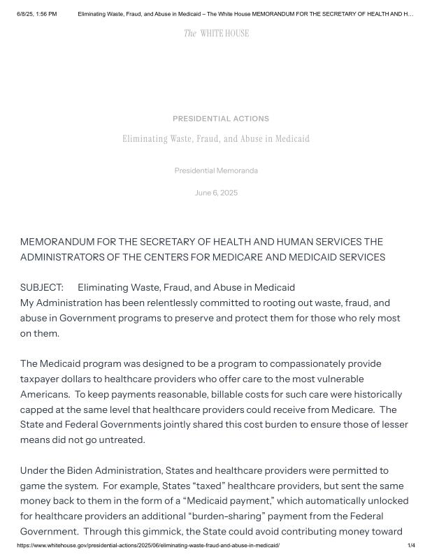 Eliminating Waste, Fraud, and Abuse in Medicaid – The White House MEMORANDUM FOR THE SECRETARY OF HEALTH AND HUMAN SERVICES THE ADMINISTRATORS OF THE CENTERS FOR MEDICARE AND MEDICAID SERVICES SUBJECT_ Eliminating .pdf
