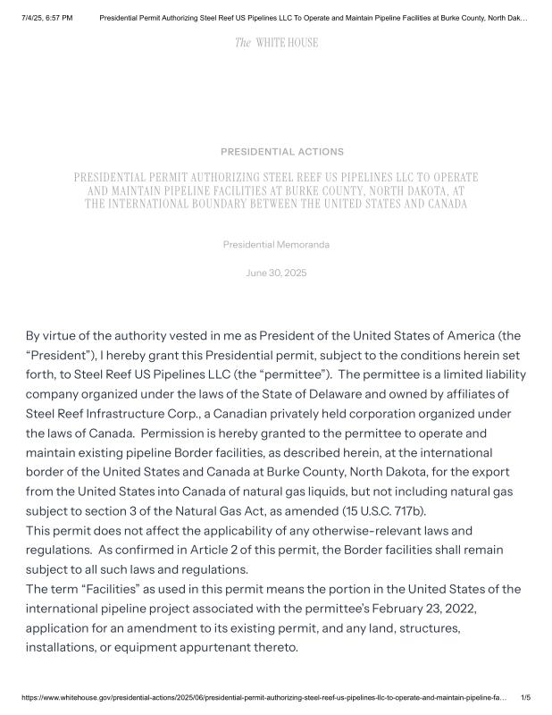 dropbox/COLLECTION- Government/The White House/Memorandums/Presidential Permit Memorandums/Presidential Permit Authorizing Steel Reef US Pipelines LLC To Operate and Maintain Pipeline Facilities at Burke County, North Dakota, at the International Boundary Between the United States and Canada – The White House.pdf