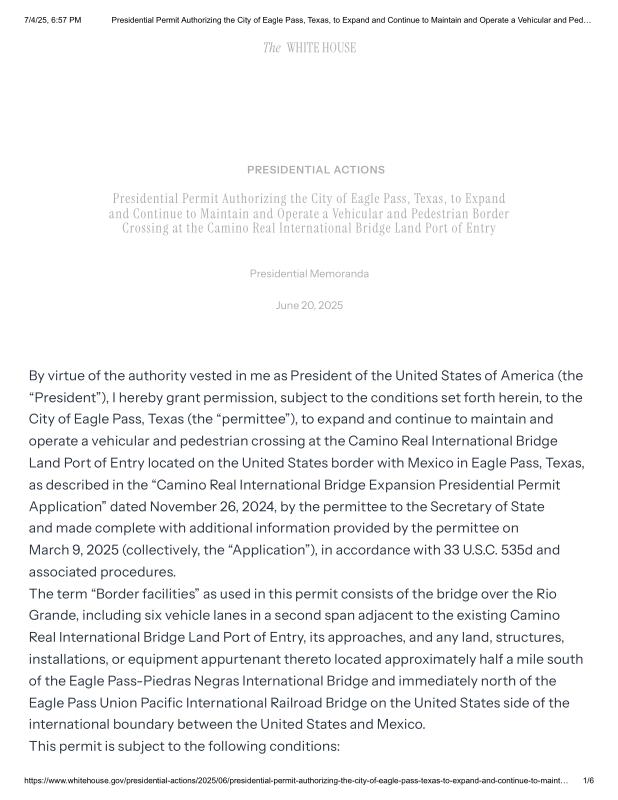 dropbox/COLLECTION- Government/The White House/Memorandums/Presidential Permit Memorandums/Presidential Permit Authorizing the City of Eagle Pass, Texas, to Expand and Continue to Maintain and Operate a Vehicular and Pedestrian Border Crossing at the Camino Real International Bridge Land Port of Entry – The White House.pdf