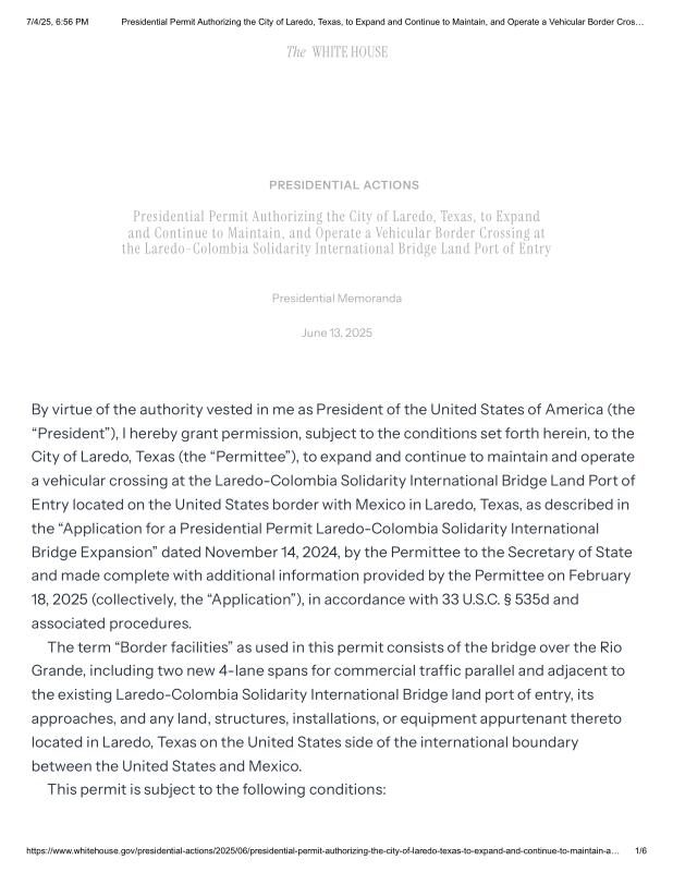 dropbox/COLLECTION- Government/The White House/Memorandums/Presidential Permit Memorandums/Presidential Permit Authorizing the City of Laredo, Texas, to Expand and Continue to Maintain, and Operate a Vehicular Border Crossing at the Laredo-Colombia Solidarity International Bridge Land Port of Entry – The White House.pdf