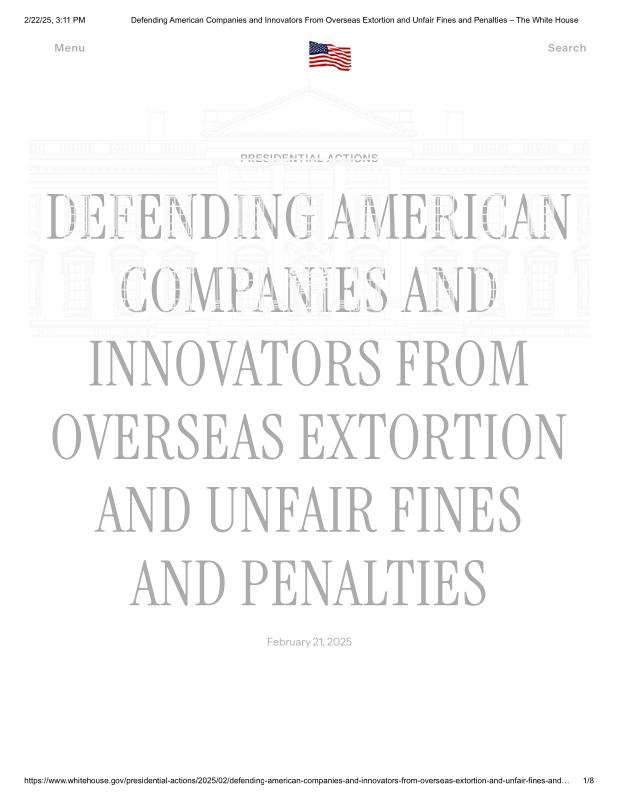 dropbox/COLLECTION- Government/The White House/Memorandums/Trade and Tax Memorandums/Defending American Companies and Innovators From Overseas Extortion and Unfair Fines and Penalties – The White House.pdf