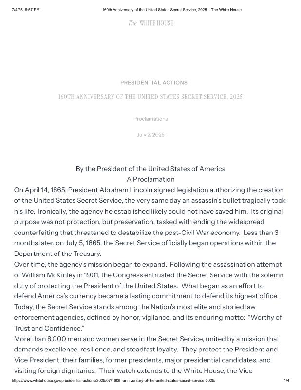 dropbox/COLLECTION- Government/The White House/Proclamations/160th Anniversary of the United States Secret Service, 2025 – The White House.pdf
