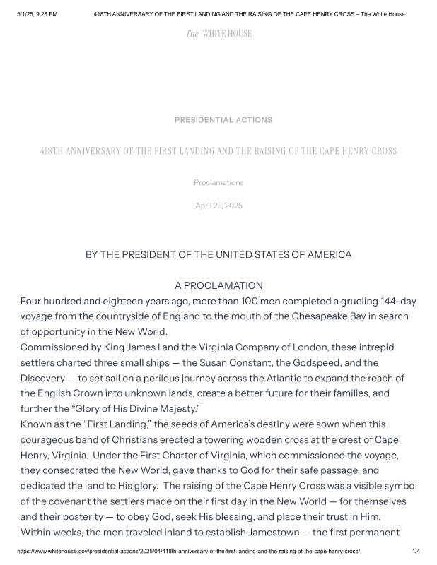 dropbox/COLLECTION- Government/The White House/Proclamations/418TH ANNIVERSARY OF THE FIRST LANDING AND THE RAISING OF THE CAPE HENRY CROSS – The White House.pdf