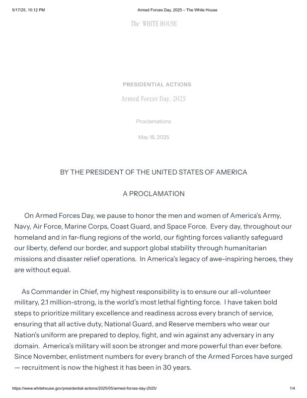 dropbox/COLLECTION- Government/The White House/Proclamations/Armed Forces Day, 2025 – The White House.pdf