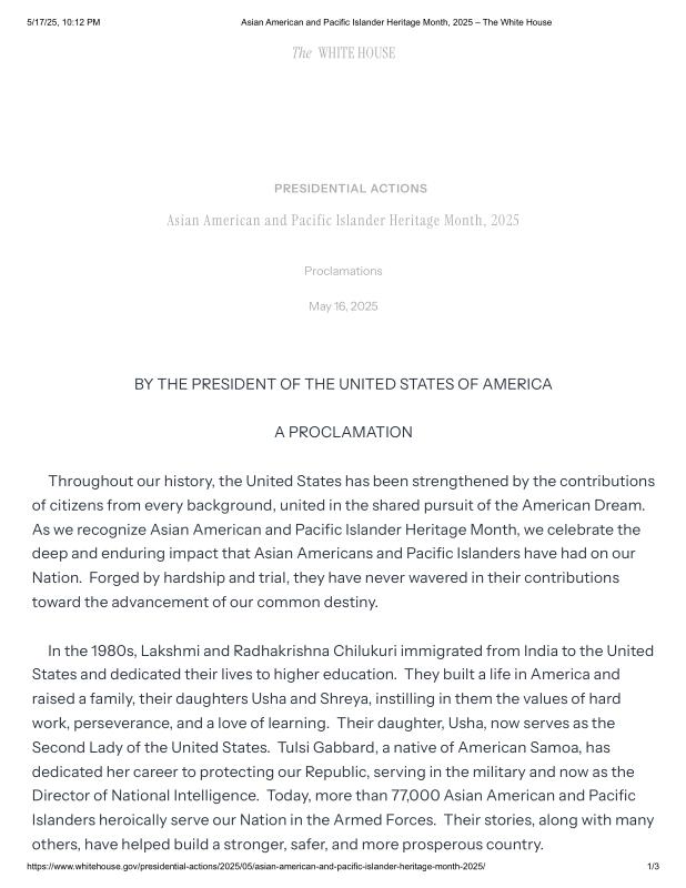 dropbox/COLLECTION- Government/The White House/Proclamations/Asian American and Pacific Islander Heritage Month, 2025 – The White House.pdf