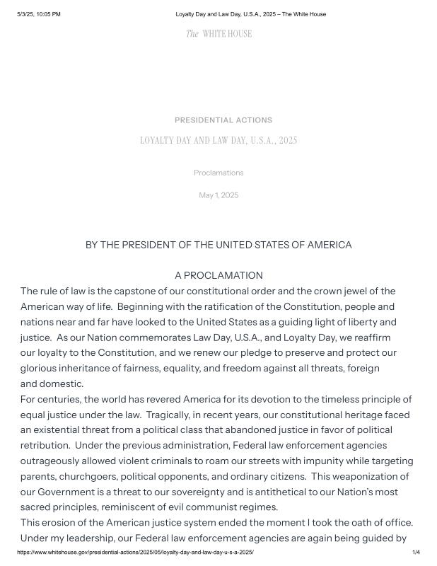dropbox/COLLECTION- Government/The White House/Proclamations/Loyalty Day and Law Day, U.S.A., 2025 – The White House.pdf