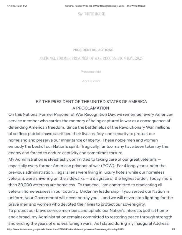 dropbox/COLLECTION- Government/The White House/Proclamations/National Former Prisoner of War Recognition Day, 2025 – The White House.pdf