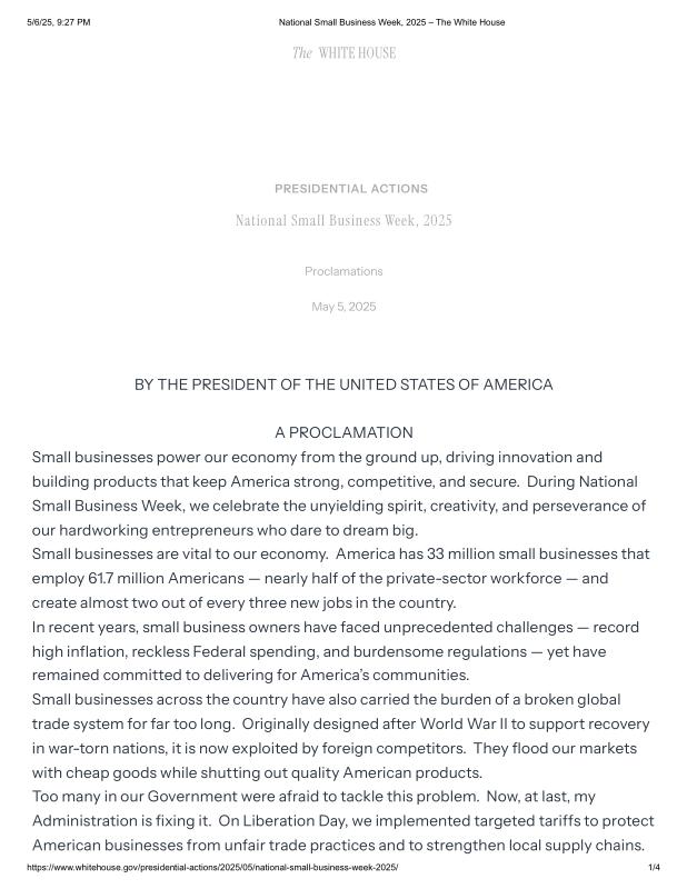dropbox/COLLECTION- Government/The White House/Proclamations/National Small Business Week, 2025 – The White House.pdf