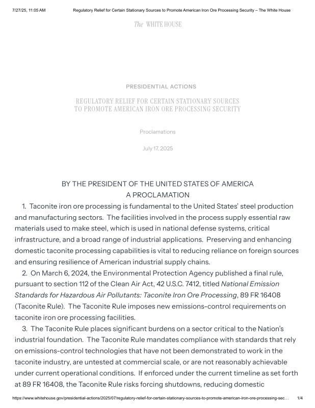 dropbox/COLLECTION- Government/The White House/Proclamations/Regulatory Relief for Certain Stationary Sources to Promote American Iron Ore Processing Security – The White House.pdf