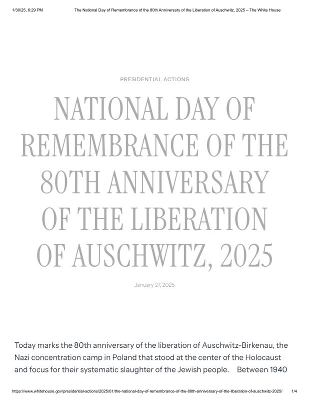 dropbox/COLLECTION- Government/The White House/Proclamations/The National Day of Remembrance of the 80th Anniversary of the Liberation of Auschwitz, 2025 – The White House.pdf