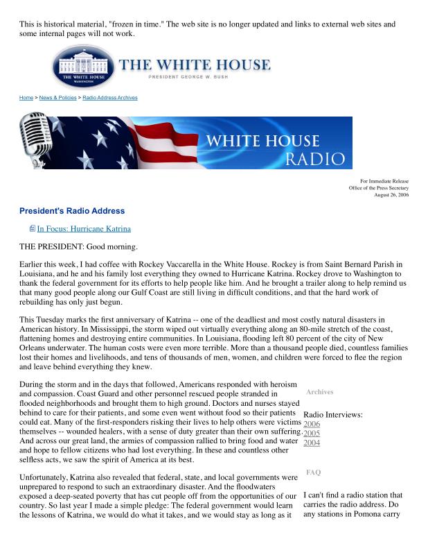 dropbox/COLLECTION- Research/Katrina Batch 1/bush white house/President's Radio Address.pdf