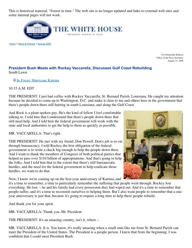 dropbox/COLLECTION- Research/Katrina Batch 1/bush white house/President Bush Meets with Rockey Vaccarella, Discusses Gulf Coast Rebuilding.pdf