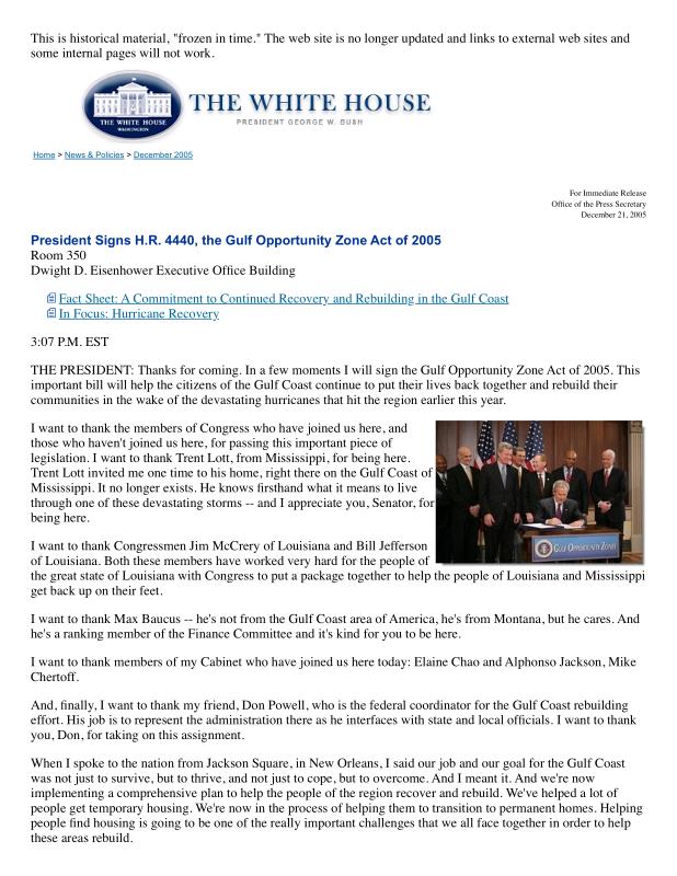 dropbox/COLLECTION- Research/Katrina Batch 1/bush white house/President Signs H.R. 4440, the Gulf Opportunity Zone Act of 2005.pdf
