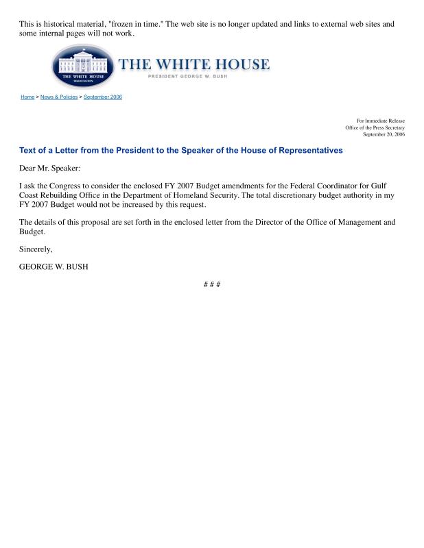dropbox/COLLECTION- Research/Katrina Batch 1/bush white house/Text of a Letter from the President to the Speaker of the House of Representatives.pdf