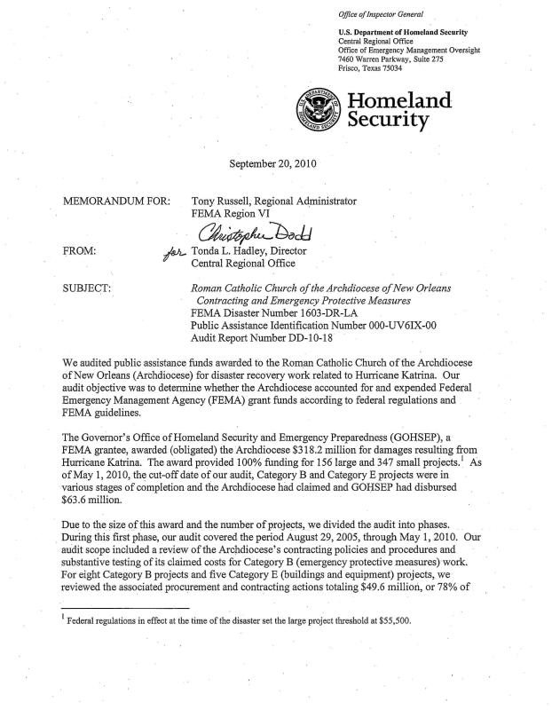 dropbox/COLLECTION- Research/Katrina Batch 1/Dept of Homeland Security Katrina/Roman Catholic Church Archdiocese New Orleans FEMA 1603-DR-LA Public Assistance 000-UV6IX-00 Audit Report DD-I0-18.pdf