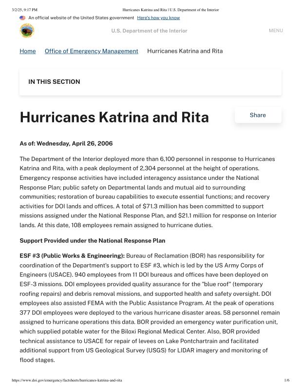 dropbox/COLLECTION- Research/Katrina Batch 1/Dept of Interior Katrina/Hurricanes Katrina and Rita _ U.S. Department of the Interior.pdf