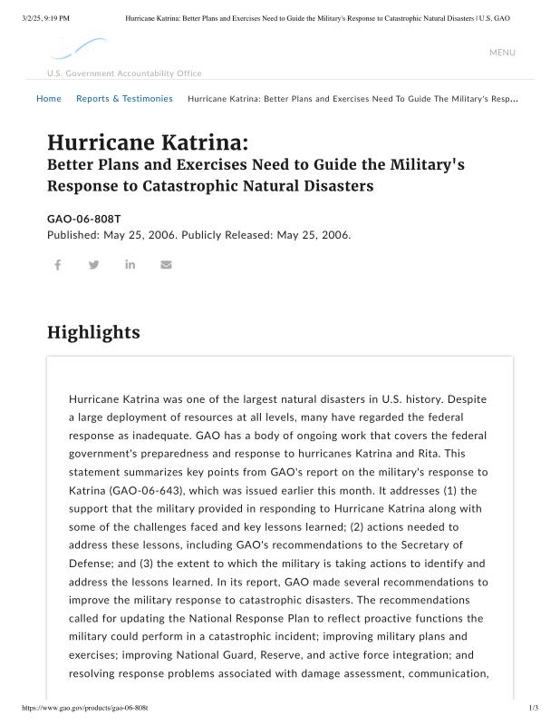 dropbox/COLLECTION- Research/Katrina Batch 1/GovAccountability Office/Hurricane Katrina_ Better Plans and Exercises Need to Guide the Military's Response to Catastrophic Natural Disasters _ U.S. GAO.pdf