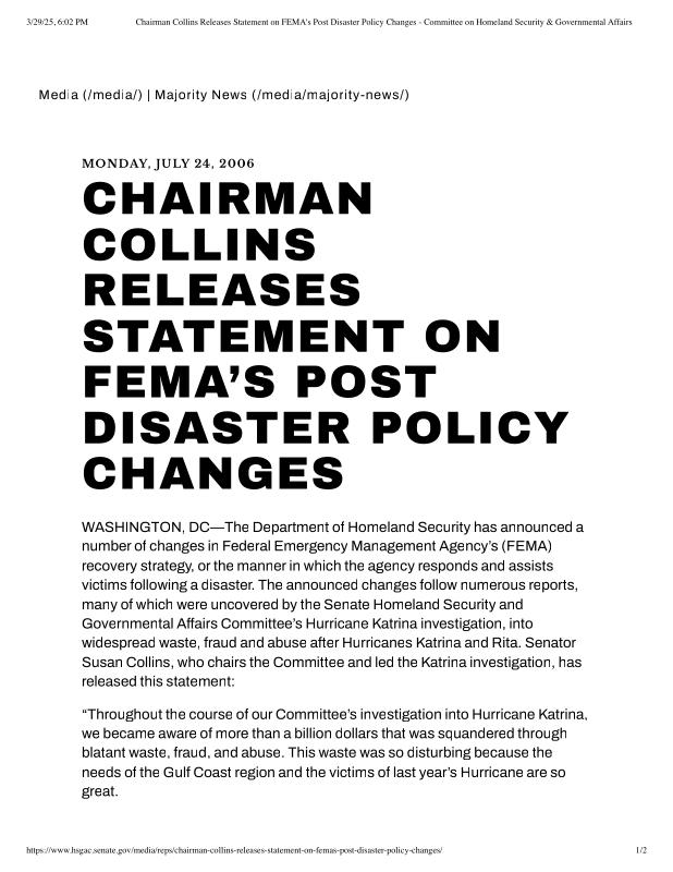 dropbox/COLLECTION- Research/Katrina Batch 2/katrina homeland security response/Chairman Collins Releases Statement on FEMA's Post Disaster Policy Changes - Committee on Homeland Security & Governmental Affairs.pdf