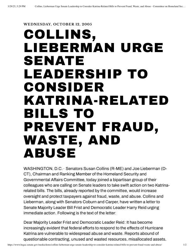 dropbox/COLLECTION- Research/Katrina Batch 2/katrina homeland security response/Collins, Lieberman Urge Senate Leadership to Consider Katrina-Related Bills.pdf