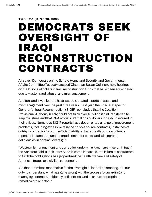 dropbox/COLLECTION- Research/Katrina Batch 2/katrina homeland security response/Democrats Seek Oversight of Iraqi Reconstruction Contracts - Committee on Homeland Security & Governmental Affairs.pdf