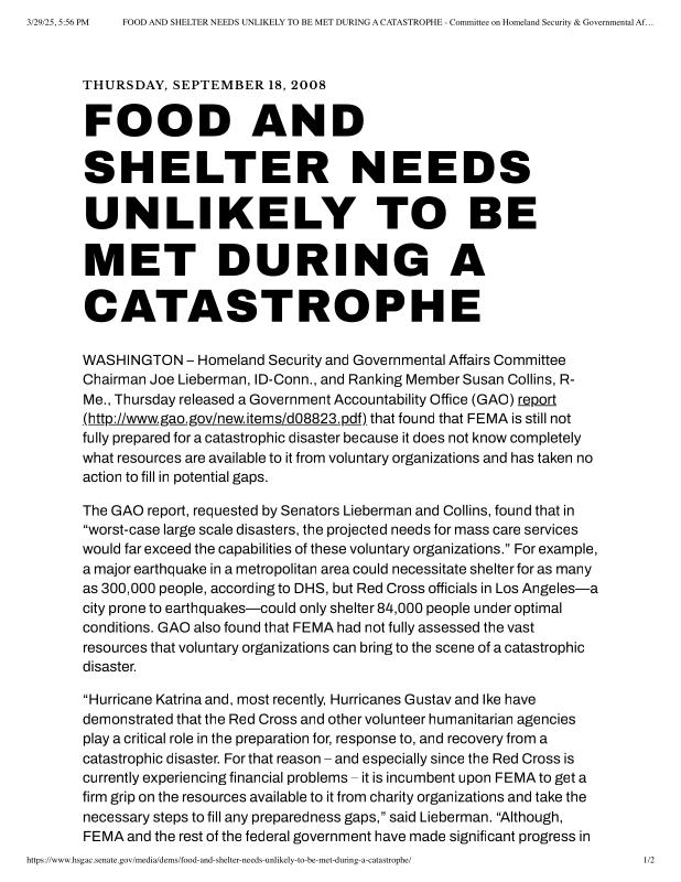 dropbox/COLLECTION- Research/Katrina Batch 2/katrina homeland security response/FOOD AND SHELTER NEEDS UNLIKELY TO BE MET DURING A CATASTROPHE - Committee on Homeland Security & Governmental Affairs.pdf