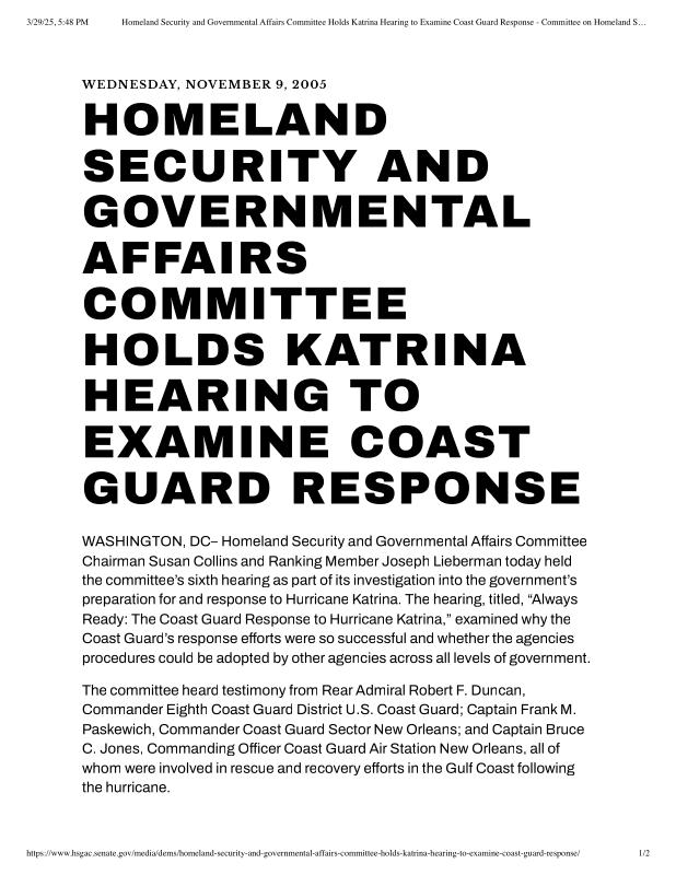 dropbox/COLLECTION- Research/Katrina Batch 2/katrina homeland security response/Homeland Security and Governmental Affairs Committee Holds Katrina.pdf