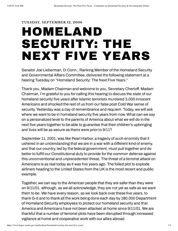 dropbox/COLLECTION- Research/Katrina Batch 2/katrina homeland security response/Homeland Security_ The Next Five Years - Committee on Homeland Security & Governmental Affairs.pdf