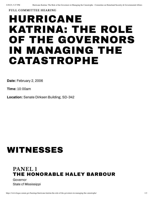 dropbox/COLLECTION- Research/Katrina Batch 2/katrina homeland security response/Hurricane Katrina_ The Role of the Governors in Managing the Catastrophe - Committee on Homeland Security & Governmental Affairs.pdf