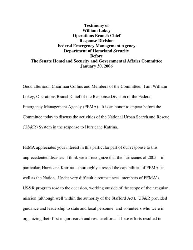 dropbox/COLLECTION- Research/Katrina Batch 2/katrina homeland security response/I am William Lokey, Operations Branch Chief of the Response Division of FEMA.pdf