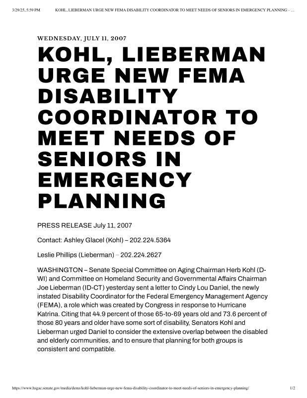 dropbox/COLLECTION- Research/Katrina Batch 2/katrina homeland security response/KOHL, LIEBERMAN URGE NEW FEMA DISABILITY COORDINATOR TO MEET NEEDS OF SENIORS IN EMER.pdf