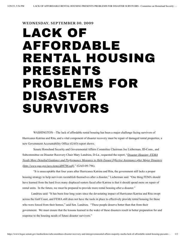 dropbox/COLLECTION- Research/Katrina Batch 2/katrina homeland security response/LACK OF AFFORDABLE RENTAL HOUSING PRESENTS PROBLEMS FOR DISASTER SURVIVORS - Committee on Homeland Security & Governmental Affairs.pdf