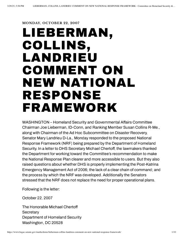 dropbox/COLLECTION- Research/Katrina Batch 2/katrina homeland security response/LIEBERMAN, COLLINS, LANDRIEU COMMENT ON NEW NATIONAL RESPONSE FRAMEWORK - Committee on Homeland Security & Governmental Affairs.pdf