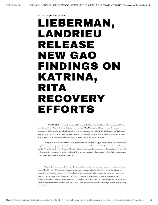 dropbox/COLLECTION- Research/Katrina Batch 2/katrina homeland security response/LIEBERMAN, LANDRIEU RELEASE NEW GAO FINDINGS ON KATRINA, RITA RECOVERY EFFORTS.pdf