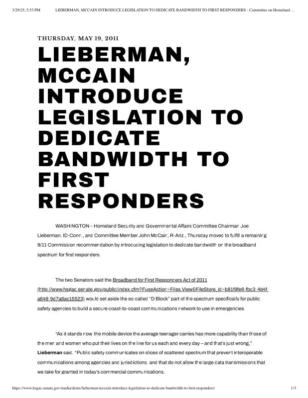 dropbox/COLLECTION- Research/Katrina Batch 2/katrina homeland security response/LIEBERMAN, MCCAIN INTRODUCE LEGISLATION TO DEDICATE BANDWIDTH TO FIRST RESPONDERS.pdf