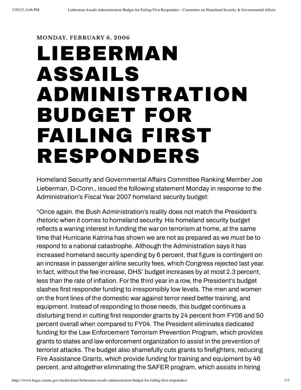 dropbox/COLLECTION- Research/Katrina Batch 2/katrina homeland security response/Lieberman Assails Administration Budget for Failing First Responders - Committee on Homeland Security & Governmental Affairs.pdf