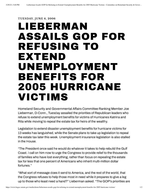 dropbox/COLLECTION- Research/Katrina Batch 2/katrina homeland security response/Lieberman Assails GOP for Refusing to Extend Unemployment Benefits for 200.pdf