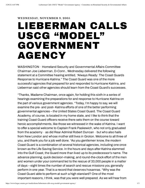 dropbox/COLLECTION- Research/Katrina Batch 2/katrina homeland security response/Lieberman Calls USCG _Model_ Government Agency - Committee on Homeland Security & Governmental Affairs.pdf