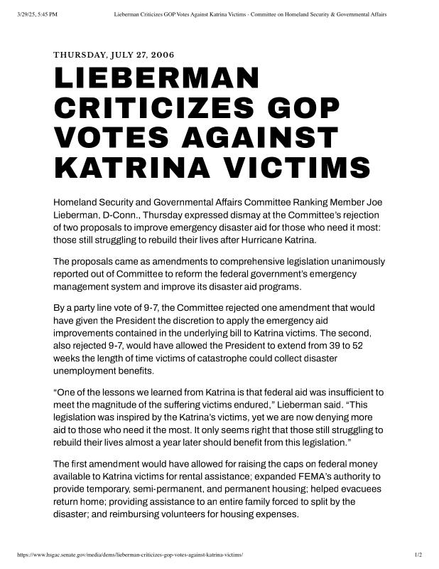 dropbox/COLLECTION- Research/Katrina Batch 2/katrina homeland security response/Lieberman Criticizes GOP Votes Against Katrina Victims - Committee on Homeland Security & Governmental Affairs.pdf
