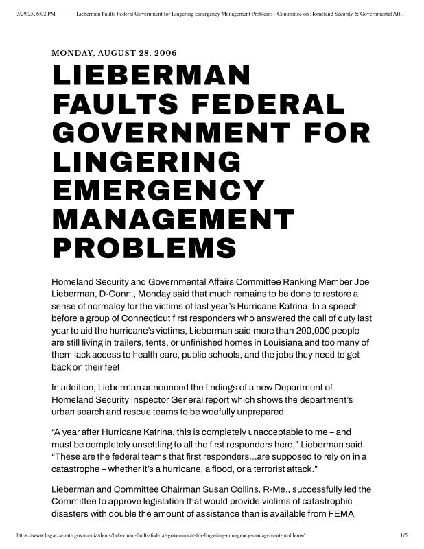dropbox/COLLECTION- Research/Katrina Batch 2/katrina homeland security response/Lieberman Faults Federal Government for Lingering Emergency Management Problems - Committee on Homeland Security & Governmental Affairs.pdf