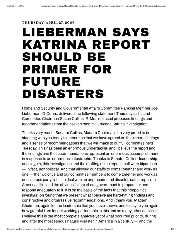 dropbox/COLLECTION- Research/Katrina Batch 2/katrina homeland security response/Lieberman Says Katrina Report Should Be Primer for Future Disasters - Committee on Homeland Security & Governmental Affairs.pdf